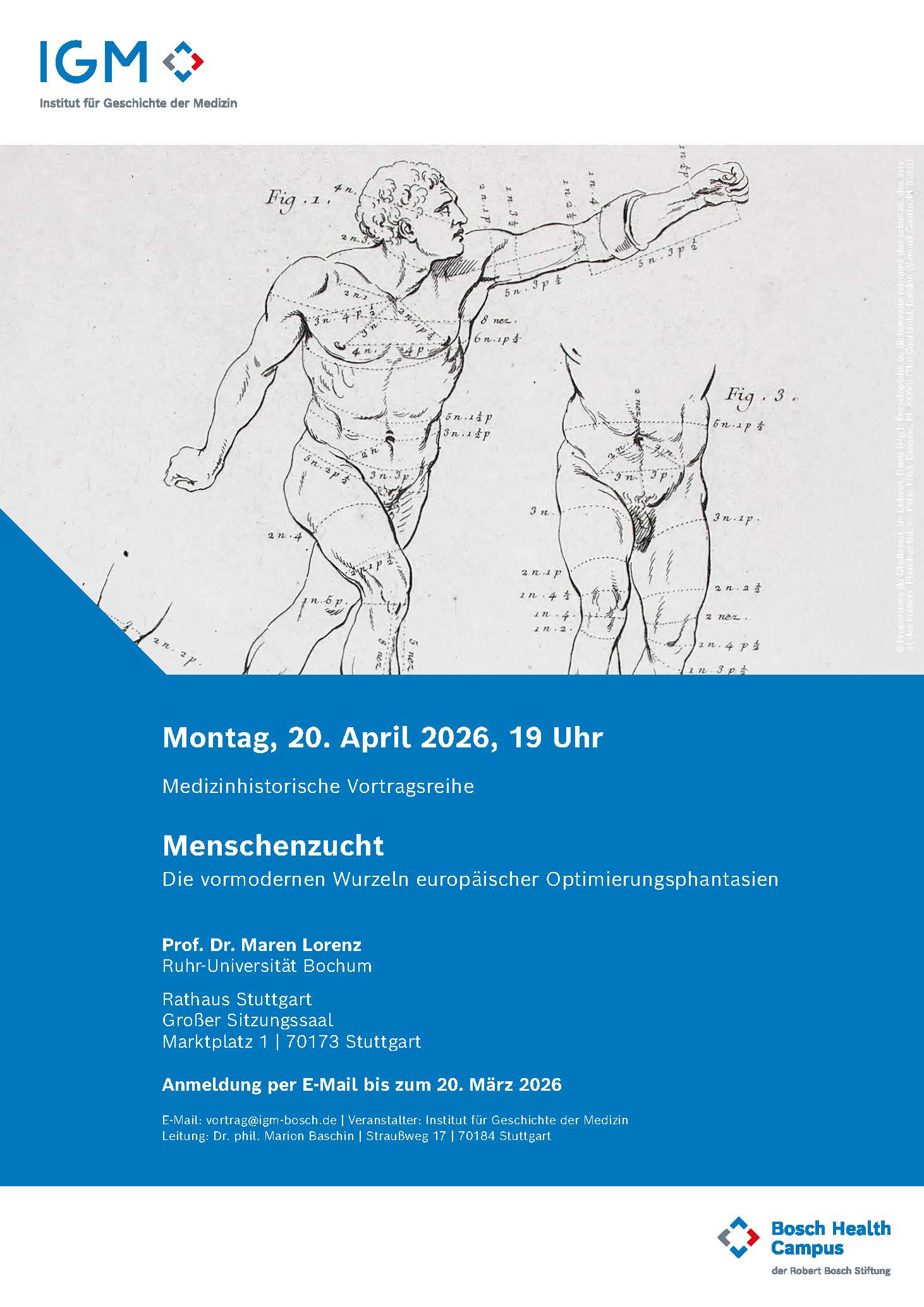 Seit ungefähr 40 Jahren veranstaltet das IGM Publikumsvorträge, die im Laufe der Zeit immer mehr Zuspruch erhielten. Inhalte sind in der Regel medizinhistorische Themen, die weitere Wissensbereiche aufgreifen. So werden verschiedene aktuelle Forschungsschwerpunkte von Fachexpert:innen einem interessierten Publikum zugänglich gemacht. Nach der Corona-Zeit wurde die Veranstaltungsreihe erfolgreich wiederaufgenommen, so dass üblicherweise ein Kreis von 250 Personen im Stuttgarter Rathaussaal zu den regelmäßigen Gästen zählt.