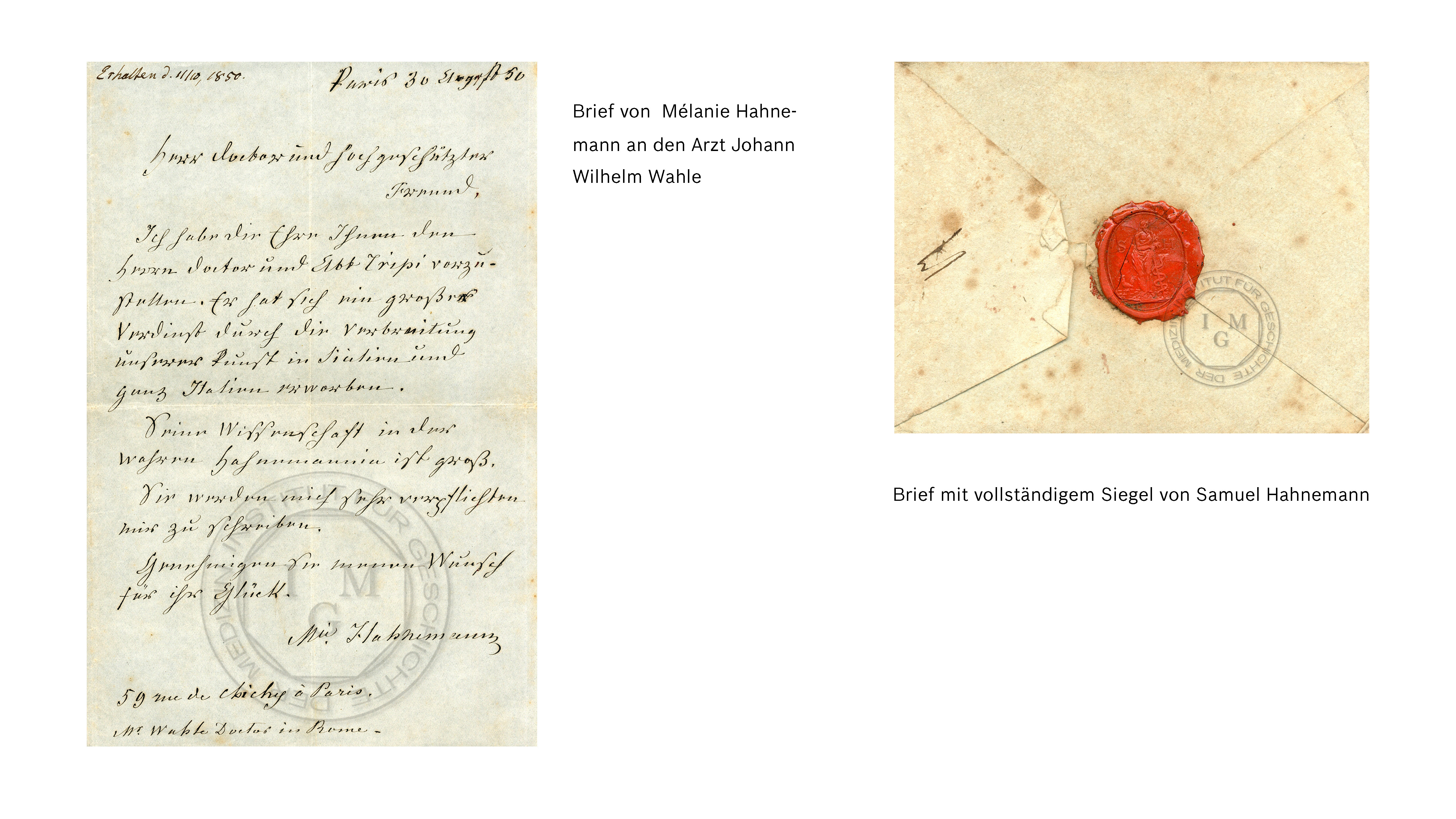 Bei einer kürzlich verlaufenen Auktion konnte das Institut für Geschichte der Medizin drei außergewöhnliche Originale ersteigern, die den Sammlungsbestand eindrucksvoll ergänzen. Bei dem ersten Stück handelt es sich um einen handschriftlichen Brief von Samuel Hahnemann – mit vollständig erhaltenem Siegel – an den Magdeburger Kaufmann Heinrich Weigel vom 27.07.1831. Der Brief ist die Antwort auf den Patientenbrief von Emma Weigel (Ehefrau von Heinrich Weigel), der bereits im Institut verwahrt wird. Hahnemann schickt ein Pülverchen und empfiehlt zudem das Buch „Die Allöopathie. Ein Wort der Warnung an Kranke jeder Art“. Das Werk war 1831 erschienen. Die Empfehlung zeigt, dass Hahnemann seinen Patienten über die reine Arzneimittelanwendung hinaus Ratschläge gab. Der zweite Brief von Samuel Hahnemann vom April 1838, also schon zu den Zeiten, als er in Paris gelebt hat, geht an einen befreundeten Homöopathen, dem er versichert: „und so werden Sie auch immer als einer meiner besten Schüler vor allen den Prahl-Hänsen den Vorzug behalten“. Der Brief ist am Kopf mit den Initialen seiner Frau Mélanie Hahnemann geprägt. Der dritte Brief ist deutlich jünger datiert (30.08.1850), darin schreibt Mélanie Hahnemann an den Arzt Johann Wilhelm Wahle in Rom und stellt ihm den Abt Tripi vor, der sich für die Verbreitung der Homöopathie in Sizilien und Italien eingesetzt hat. Auch hier verwahrt das Institut mit dem Nachlass von Johann Wilhelm Wahle die Gegenüberlieferung. Die Briefe sind digitalisiert und können somit auch von Extern erforscht werden. Das Institut für Geschichte der Medizin (IGM) mit Sitz in Stuttgart ist eine einzigartige Forschungseinrichtung mit einem besonderen Schwerpunkt im Bereich der Geschichte komplementärer Heilweisen, besonders der Homöopathie und des Pluralismus in der Medizin. Seit 2020 fungiert das 1980 gegründete Institut als Gesamtarchiv aller Einrichtungen der Robert Bosch Stiftung und hat daher die Aufgabe, das Erbe Robert Boschs in all seinen Facetten und Einrichtungen zu pflegen. Zum IGM gehören eine Forschungsbibliothek mit mehr als 65.000 Bänden sowie ein „Homöopathie-Archiv“, das u. a. den Nachlass von Samuel Hahnemann und die Überlieferung internationaler und nationaler Organisationen von Homöopathen aufbewahrt.